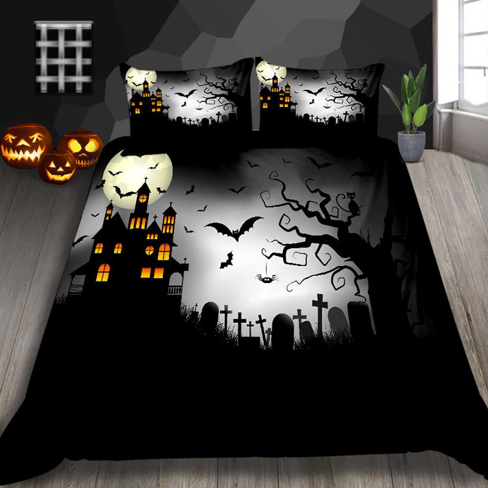 Halloween Bedding Set Queen Size Castle And Cemetery Print 3d
